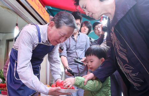 간담회를 마친 허창수 회장은 직접 과일가게 상인이 되어 앞치마를 두른 채 바쁘게 손님용 시식 과일을 준비하며 지나가는 행인을 대상으로 과일을 권유하며 판매에 여념이 없었다.