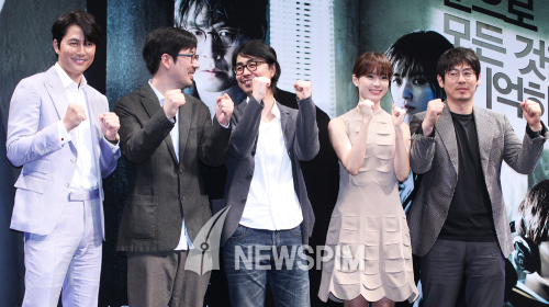 [뉴스핌=강소연 기자] 배우 정우성, 김병서 감독, 조의석 감독, 한효주, 설경구(왼쪽부터)가 4일 오전 서울시 강남구 신사동 CGV에서 열린 영화 '감시자들' 제작보고회에 참석해 포토타임을 갖고있다.