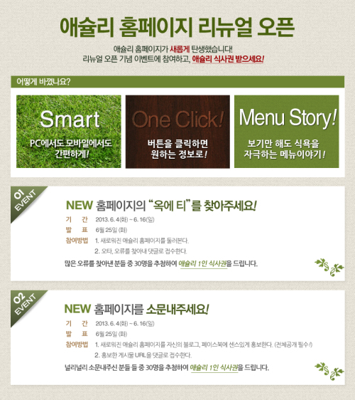 첫 번째 이벤트는 ‘NEW 홈페이지의 옥의 티를 찾아주세요!’. 새로워진 홈페이지를 둘러본 후 오타나 오류를 찾아내 댓글로 접수하면 된다. 많은 오류를 찾아낸 30명을 추첨하여 애슐리 식사권을 제공한다.