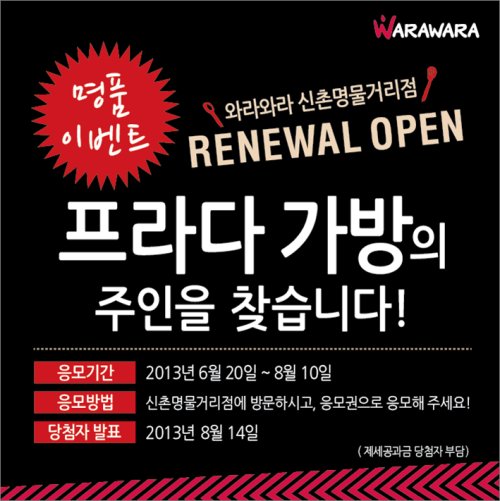 와라와라 신촌명물거리점 매장에서는 명품 가방을 증정하는 이벤트를 실시한다. 매장 방문 후 응모권을 작성하여 응모함에 넣으면 추첨을 통해 1명에게 180만원 상당의 프라다 백을 증정한다.
