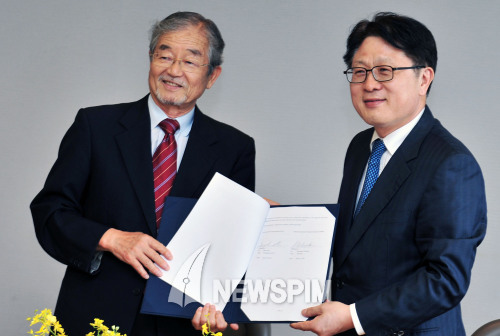 | LG전자 안승권 사장(오른쪽)과 일본 NIMS 스케카츠 우시오다 이사장(왼쪽)이 26일 일본 츠쿠바에서 열린 LG-NIMS 소재과학연구센터 구축 조인식에서 기념촬영을 하고 있다.<사진=LG전자> |