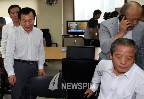 [뉴스핌=김학선 기자] 4일 오전 서울 여의도 개성공단 정상화 촉구 비상대책위원회 사무실에서 개성공단 입주 기업인들이 통일부 긴급 브리핑을 지켜본 후 돌아서고 있다. 정부는 북측에 오는 6일 개성공단과 관련해 남북 당국간 실무회담을 제의했다.