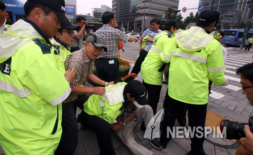 [뉴스핌=김학선 기자] 전국교직원노동조합이 9일 오전 서울 광화문 광장에서 국정원 선거개입 규탄 기자회견을 연 가운데 보수단체 회원들이 집회를 방해하자 경찰이 제지하고 있다.