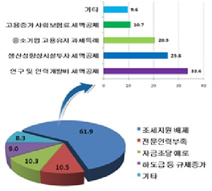 조세지원 확대가 필요한 이유로는 연구 및 기술개발 세액공제 33.6%, 생산성 향상투자 공제 25.6%, 고용유지 과세특례 20.5% 등이 언급됐다.