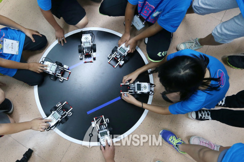 | ▲ 22일부터 24일까지 경희대학교 국제캠퍼스에서 열리고 있는 '소프트웨어 캠프'에 참가한 학생들이 직접 프로그래밍한 소프트웨어로 로봇을 동작시켜보고 있다.<사진=삼성전자> |