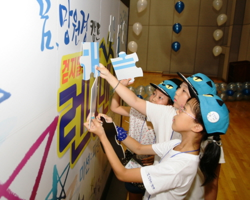 | ‘꿈 망원경 캠프’에 참가한 아이들이 꿈에 대한 미션을 수행한 후 받은 퍼즐을 보드에 맞추고 있다. |