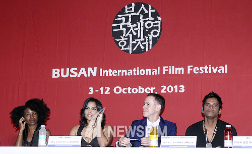 [뉴스핌=강소연 기자] 제작자 나넷 남스, 배우 사하나 고스와미, 프로듀서 데이비드 루샤, 배우 디베시 란잔(왼쪽부터)이 3일 오후 부산 해운대구 영화의전당 중극장에서 열린 제18회 부산국제영화제(BIFF) 개막작 '바라:축복' 기자회견에 참석해 질의응답을 하고 있다.