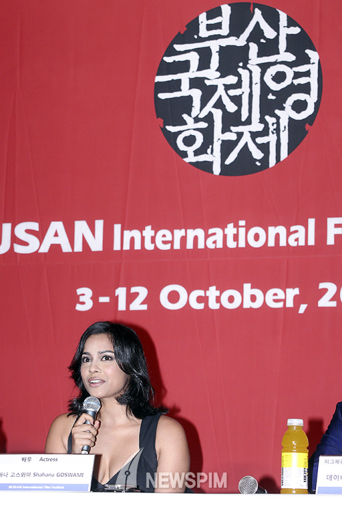 [뉴스핌=강소연 기자] 배우 사하나 고스와미가 3일 오후 부산 해운대구 영화의전당 중극장에서 열린 제18회 부산국제영화제(BIFF) 개막작 '바라:축복' 기자회견에 참석해 질의응답을 하고 있다.