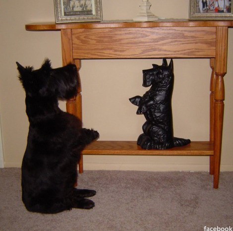 사진 속 검은색 강아지는 흡사 자신과 똑같이 생긴 모양의 조각상 앞에 서 있다. 이 강아지는 조각상과 닮은 걸 눈치 채고 같은 포즈를 취하며 자아를 찾은 듯해 웃음을 자아냈다.