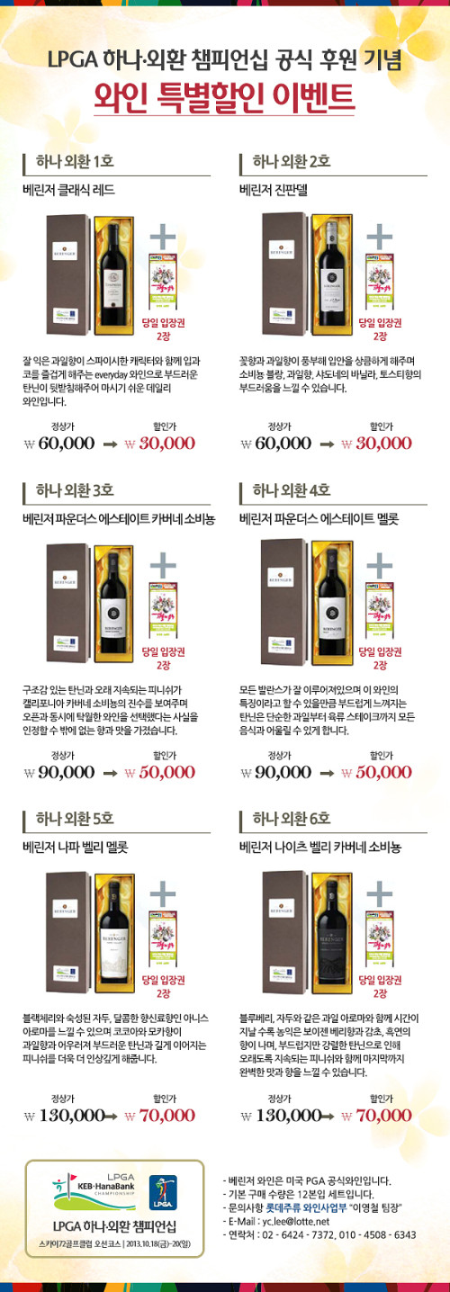 ‘하나-외환 챔피언십’ 홈페이지(www.kebhanabankgolf.com)에 있는 ‘와인 이벤트’ 코너에서는 베린저 클래식 레드 등 총 6종의 와인 1병과 골프대회 초대권 2매가 들어있는 세트를 최대 50% 할인한다.