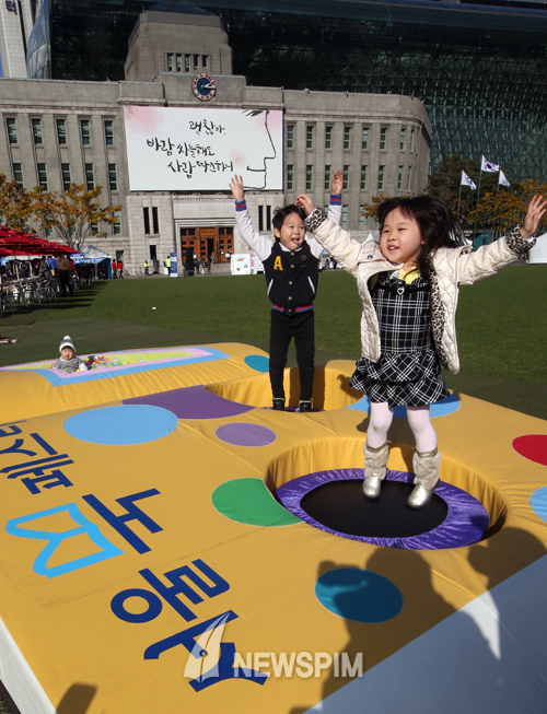 [뉴스핌=김학선 기자] 7일 오후 서울광장에서 열린 '2013 서울북페스티벌'을 찾은 어린이들이 책 모양의 조형물에서 트램펄린을 타고 있다. 문예콘서트, 공연, 동화구연대회 등이 열리는 이번 대회는 오는 9일까지 서울광장과 서울도서관에서 열린다.