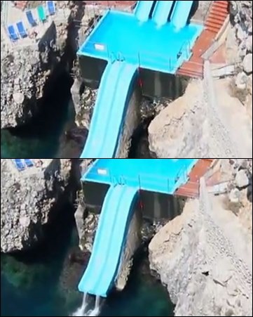 공개된 사진은 이탈리아 시칠리아섬에 위치한 호텔 수영장의 모습이다. 이 수영장에는 지중해 바다와 연결된 미끄럼대가 존재한다. 미끄럼대는 CNN이 선정한 세계에서 가장 놀라운 워터 슬라이드에 오를 정도로 유명하다고.