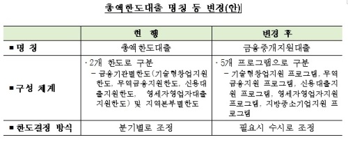 또한 금융기관별한도와 지역본부별한도의 구분을 폐지하고 대상부문별로 5개의 프로그램(기술형창업지원․무역금융지원․신용대출지원․영세자영업자지원․지방중소기업지원 프로그램)으로 재편했다.