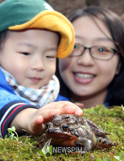 [뉴스핌=김학선 기자] 개구리가 겨울잠에서 깨어난다는 경칩을 이틀 앞둔 4일 오후 경기 과천시 서울대공원을 찾은 한 어린아이가 짝짓기 중인 개구리를 만져보며 신기해하고 있다.