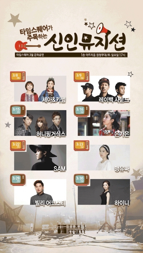 무명의 신인 뮤지션들이 대중들에게 이름을 알릴 수 있는 발판이 돼 온 타임스퀘어는, 1층 아트리움 공간을 활용해 다양한 콘셉트의 공연을 열고 있다. 이번 행사는 새로운 출발을 앞둔 이들을 위한 응원의 의미로 실력파 신인 뮤지션들을 초청해 공연을 진행한다.