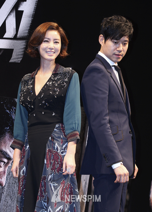 [뉴스핌=강소연 기자] 배우 김성령과 유준상(왼쪽부터)이 25일 오전 서울 강남구 신사동 압구정CGV에서 열린 영화 '표적' 제작보고회에 참석해 포토타임을 갖고 있다. 이날 김성령은 세월을 거스르는 빼어난 미모로 우아한 카리스마를 뽐냈다.
