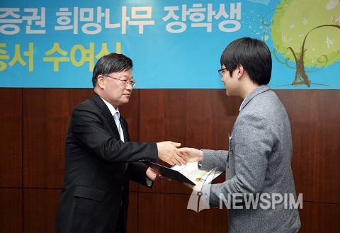 [뉴스핌=한기진 기자] 우리투자증권(대표이사 김원규, 사진 왼쪽)은 저소득층 우수 고등학생 39명을 선발해 등록금, 학교운영비, 급식비 등 학비 일체를 지원하는 '제9기 희망나무 장학생 장학증서 수여식'을 25일 본사에서 진행했다고 밝혔다.