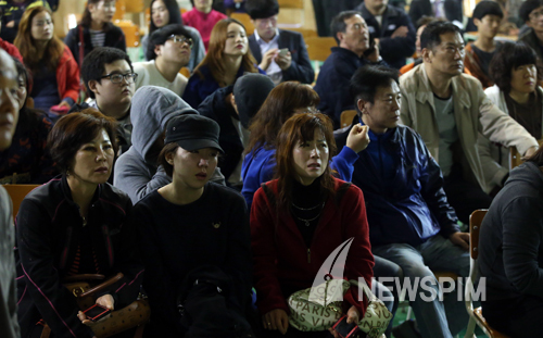 [뉴스핌=김학선 기자] 진도 여객선 침몰 소식이 전해진 16일 경기도 안산 단원고등학교에 마련된 상황실에서 사고 탑승 가족들이 학교 측의 브리핑을 듣고 있다.