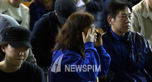 [뉴스핌=김학선 기자] 진도 여객선 침몰 소식이 전해진 16일 경기도 안산 단원고등학교에 마련된 상황실에서 사고 탑승 가족들이 학교 측의 브리핑을 듣고 있다.