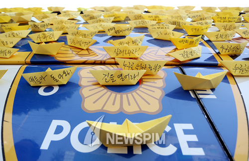 [뉴스핌=김학선 기자] 9일 청와대 인근 청운동사무소 앞에서 세월호 참사 유가족들이 자녀들의 영정을 안은 채 세월호 사고 진상규명과 책임자의 사과 등을 요구하며 박근혜 대통령과의 면담을 요구했다. 유족들이 청와대 길목을 막은 경찰차량에 종이배를 붙여 놓았다.