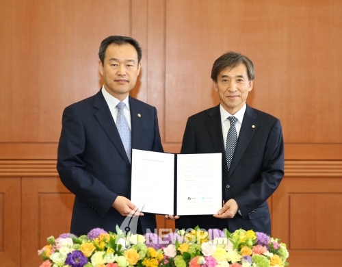 통계청 김영민 청장(좌)과 한국은행 이주열 총재(우)가 지식재산 무역수지 통계 개발을 위한 업무협력 약정을 체결했다. <자료=한국은행> |