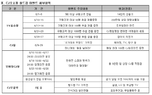 신희권 CJ오쇼핑 편성팀 팀장은 "여름시즌 소비 활성화를 위해 휴가 시즌에 필요한 경품을 위주로 준비했다"며 "이번 이벤트를 통해 모든 고객들이 함께 할 수 있는 월드컵 시즌이 되기를 기원한다"고 밝혔다.