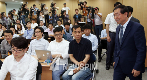 [뉴스핌=김학선 기자] 박원순 서울시장이 10일 오후 서울시청에서 출입기자들을 상대로 박원순 2기 시정운영 방향에 대해 발표하기 위해 브리핑룸으로 들어서고 있다.
