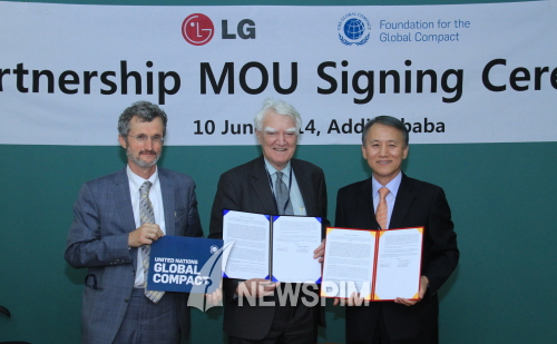 | 10일(현지시간) 에티오피아 아디스아바바에서 LG가 유엔 글로벌콤팩트(UNGC)와 유엔의 지속가능발전 목표(SDGs) 달성을 위한 파트너십 양해각서를 체결했다. 왼쪽부터 게오르그 켈(Georg Kell) UNGC 사무총장, 마크 무디 스튜어트(Mark Moody-Stuart) UNGC 재단 이사장, 김영기 ㈜LG 부사장. |