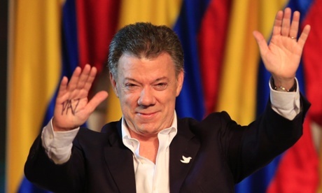 | 15일(현지시각) 연임에 성공한 후안 마뉴엘 산토스 콜롬비아 대통령이 'Peace(평화)'라고 쓴 손바닥을 펼쳐 보이고 있다.[출처: www.theguardian.com] |