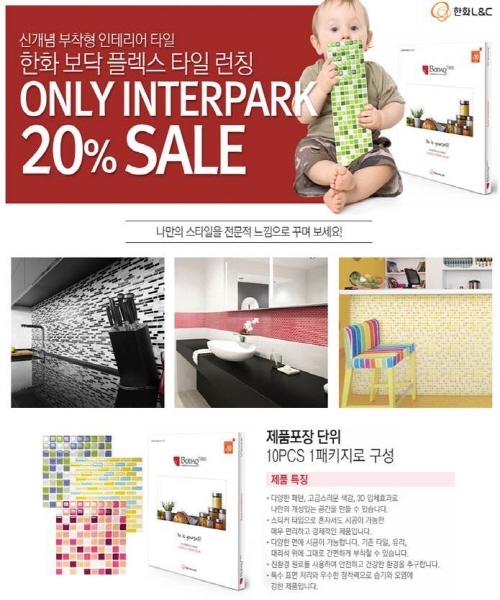 [뉴스핌=강필성 기자] 인터파크는 주방, 욕실 등 주요 공간의 분위기를 손쉽게 바꿀 수 있는 부착형 인테리어 마감재 ‘한화 L&C 보닥 플렉스 타일’을 온라인몰 단독 출시한다고 23일 밝혔다.