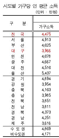 통계청이 발표한 '2013년 가계금융·복지조사'에 따르면 지난 2012년 기준 대구 지역 가구당 연 평균 소득은 3966만원으로 전국 평균치(4475만원)를 밑돈다. 같은 기간 수도권 가구당 연 평균 소득은 4809만원이다.