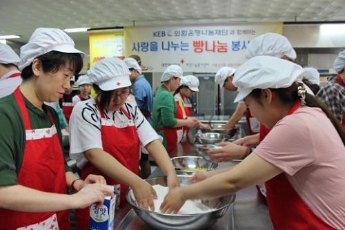 | 외환은행 직원들이 저소득층 지원을 위한 제빵 봉사활동을 펼치고 있다. |