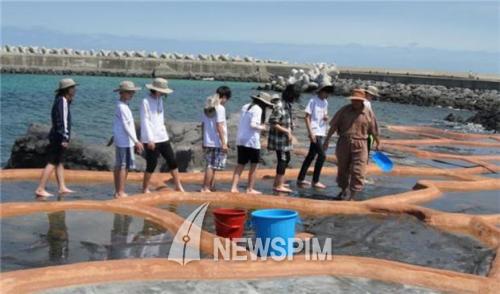 | 국제관광 어촌체험 시범마을로 지정된 제주 제주시 구엄마을에서 관광객들이 돌 염전에서 소금을 채취하는 체험을 하고 있다. (사진=해수부 제공) |
