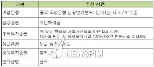 [뉴스핌=윤지혜 기자] 자산전문가들은 향후 1년간 보유할 통화상품으로 중국 국영은행 신용연계펀드와 환율을 기초자산으로 한 DLB (파생결합사채), 달러화 등을 추천했다. 환율변동성이나 환율 흐름을 겨냥한 투자자에게는 DLB나 달러(혹은 달러보험)등이, 환 변동성을 기피하는 고객에게는 위안화예금을 담보로 한 중국 신용연계펀드(완전 헤지)가 적합하다는 입장이다.