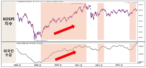 | 코스피지수와 외국인 수급추이 <자료:우리투자증권> |