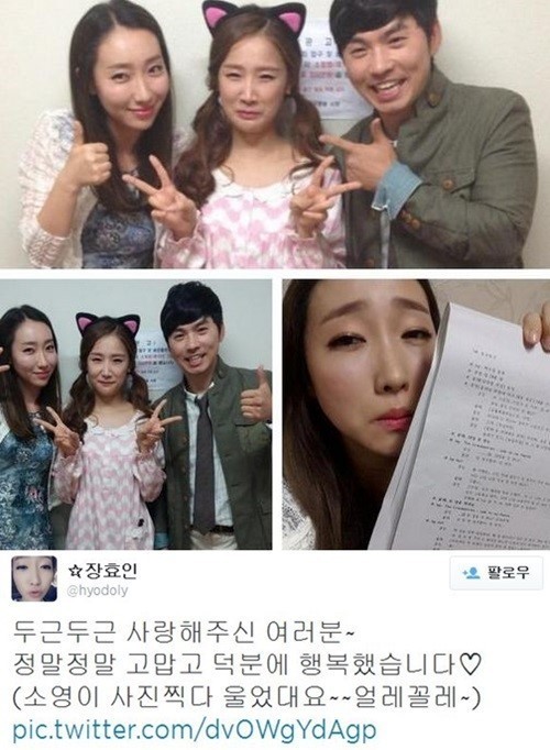 장효인은 20일 오후 방송된 ‘개그콘서트’가 끝난 뒤, 자신의 트위터에 “‘두근두근’ 사랑해주신 여러분, 정말 정말 고맙고 덕분에 행복했습니다”라는 글과 함께 사진을 게재했다.