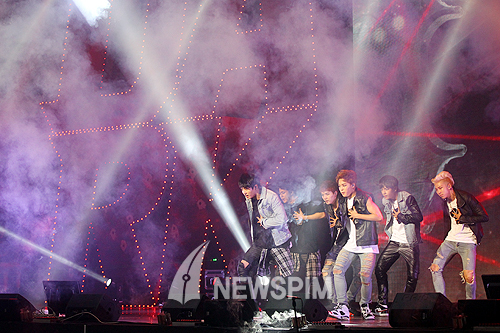19일 오후 서울 용산구 한남동 블루스퀘어에서 열린 방탄소년단 정규앨범 'DARK & WILD' 쇼케이스에 참석해 열정적인 무대를 선보이고 있다.
