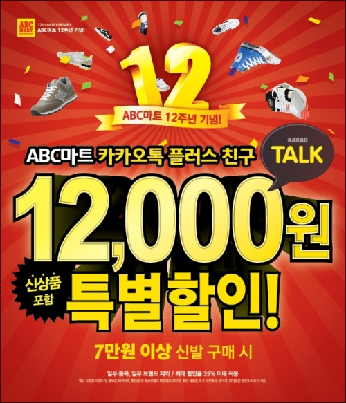 또한 12주년 기념 행사의 일환으로, ABC마트 카카오톡 플러스 친구를 추가하는 모든 고객들에게 ABC마트 1만2000원 할인 쿠폰을 제공하는 특별 이벤트도 함께 진행한다. 발급된 쿠폰은 신상품 포함, ABC마트 제품 7만원 이상 구매 시 사용할 수 있다.