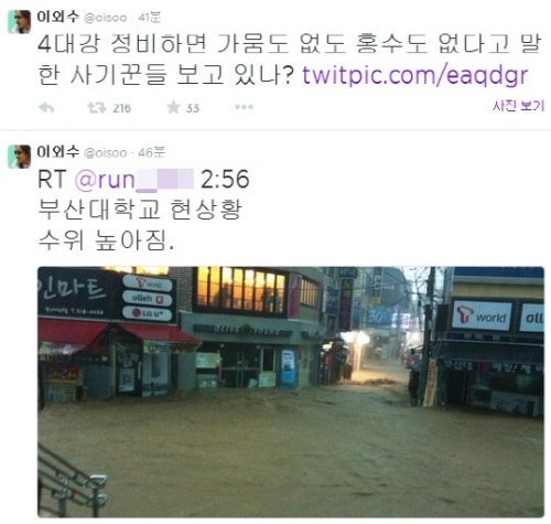 25일 이외수는 자신의 SNS를 통해 "4대강 정비하면 가뭄도 없고 홍수도 없다고 말한 사기꾼들 보고있나?"라는 글과 함께 부산 침수사진을 리트윗해 게재했다.