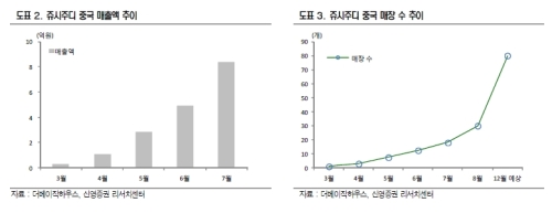 서정연 신영증권 애널리스트는 "쥬시주디는 평균 매장 수와 매출액이 3월 론칭 당시 대비 각각 18배, 24배 증가하고 주력 브랜드인 베이직하우스 여성의 점당 매출액과 비슷한 수준까지 급성장 중인 것으로 파악된다"고 전했다.