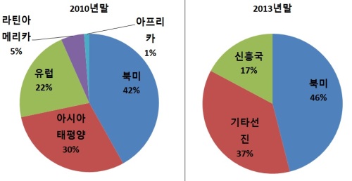 CIC의 해외 포트폴리오에서 미국 주식 투자 비중은 2012년 말 49.2%까지 높아졌으나, 2013년 말에는 46.1%로 하락했다. 반면, 여타 선진국 주식의 비중은 27.8%→36.8%로 크게 늘었다.