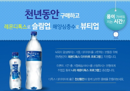 [뉴스핌=강필성 기자] 대교의 계열사 강원심층수는 프리미엄 해양심층수 ‘천년동안’ 구매 고객을 대상으로 레몬 디톡스 다이어트 제품을 증정하는 이벤트를 실시한다고 2일 밝혔다.