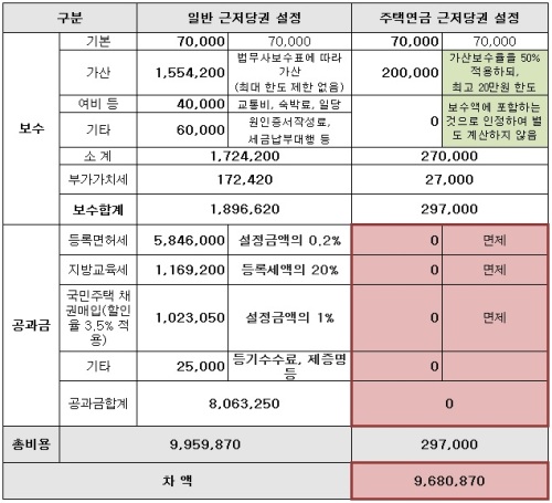 | 일반 주택담보대출 vs 주택연금(주택연금대출) 근저당 설정시 소요비용 비교 <자료=주택연금공사> |