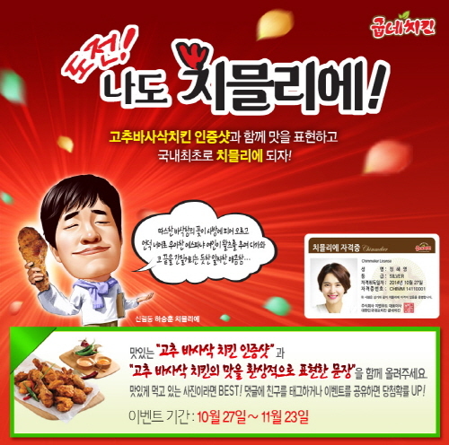[뉴스핌=강필성 기자] 굽네치킨은 공식 페이스북을 통해 고추 바사삭 치킨을 먹고 환상적인 표현을 해주는 참여자를 선발해 ‘치믈리에 자격증’을 발급한다고 27일 밝혔다.