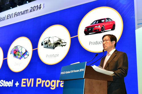 | <권오준 포스코 회장이 28일 2014포스코 글로벌 EVI포럼에서 기조연설을 하고 있다> |