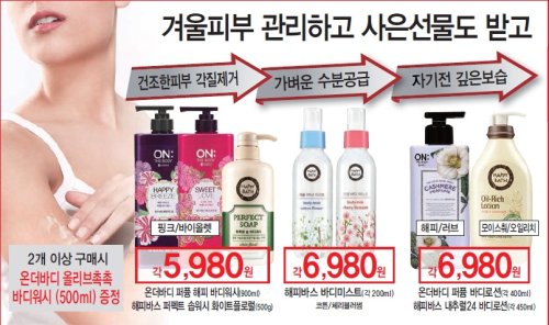 바디로션은 해피바스 내츄럴 바디로션 450ml 2종과 온더바디 바디로션 400ml 2종을 정상가 대비 각각 56%, 20% 할인된 6980원에 판매한다. 관련 제품을 2개 이상 구매하는 고객에게는 온더바디 올리브촉촉 바디워시 500ml를 사은품으로 증정한다.