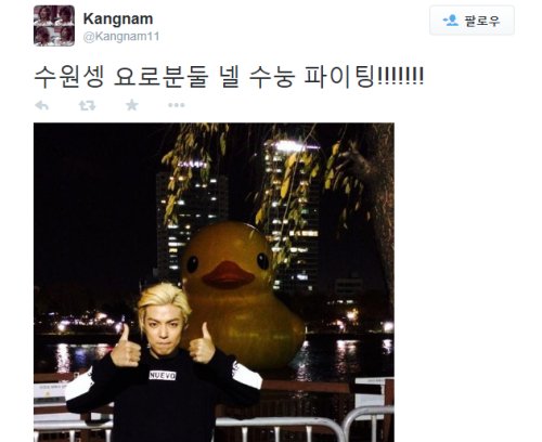 | 강남 "수원셍 요로분들 수눙 파이팅!"…귀여운 `수능 화이팅` [사진=강남 트위터] |