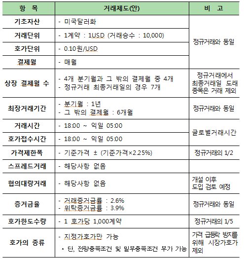 거래단위는 1계약에 1달러다. 호가단위는 달러당 0.1원이다. 호가 한도수량은 1 호가당 1000계약으로 정규거래의 20% 수준이다.