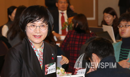 [뉴스핌=김학선 기자] 권선주 IBK기업은행장이 23일 오전 서울 명동 로얄호텔에서 열린 취임 1주년 기념 기자간담회에 참석해 밝은 표정으로 연단에 오르고 있다.