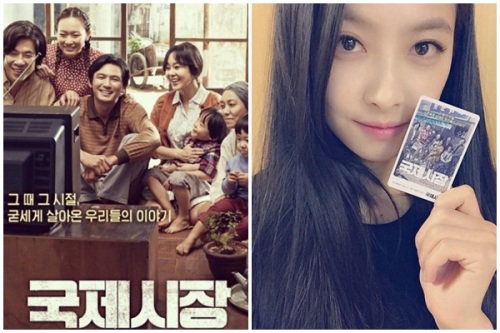 이날 소녀시대 수영도 ‘국제시장’ 포스터를 인스타그램에 게재하며 영화를 극찬했다. 수영은 “할아버지, 할머니, 부모님께 효도합시다. ‘국제시장’ 꼭 보세요. 두 번 봐요. 세 번 봐요”라고 말해 눈길을 끌었다.